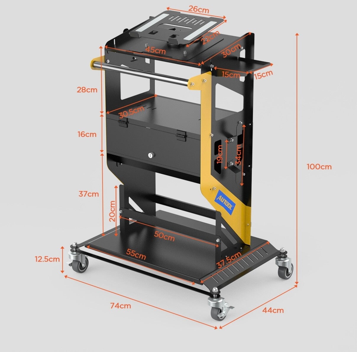 The trolley has a high-strength aluminum alloy frame, which provides a solid structure capable of carrying diagnostic tools and other equipment. It is ideal for improving work efficiency, protecting tools and equipment, facilitating movement and storage, adapting to a variety of work environments, and enhancing safety and stability. It can bring great convenience to automotive diagnosis and repair work and is an essential professional tool in automotive repair.