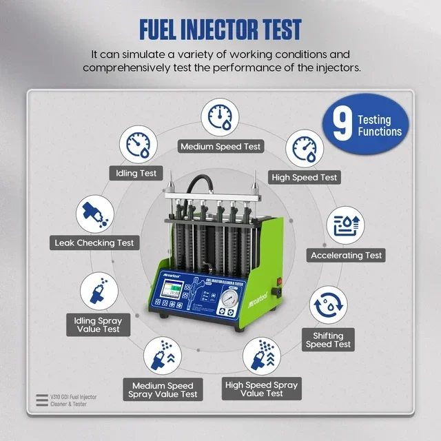 MR CARTOOL V310 Auto GDI Brandstofinjectoren Tester Reinigingsmachine kan worden gebruikt om de koolstofafzettingen op ZES injectoren tegelijkertijd volledig te verwijderen en een brandstofinjector in goede of slechte staat te diagnosticeren, op grote schaal toegepast op standaard injectoren, GDI-injectoren, EFI-injectoren, FSI-injectoren, compatibel met 99% auto's en motorfietsen.