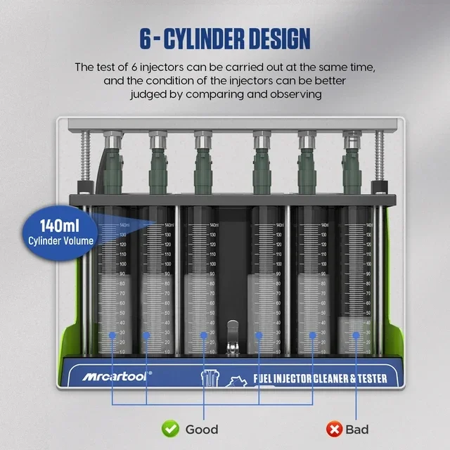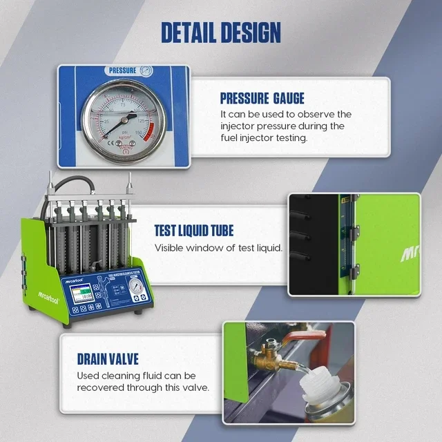 • . [6-cilinder & 2 afvoerhavens ontwerp]: MRCARTOOL V310 kan 6 injectoren tegelijkertijd testen en reinigen voor een betere efficiëntie; het heeft ook beide regelkleppen voor het aftappen van reinigingsoplossingen en testvloeistofterugwinning..