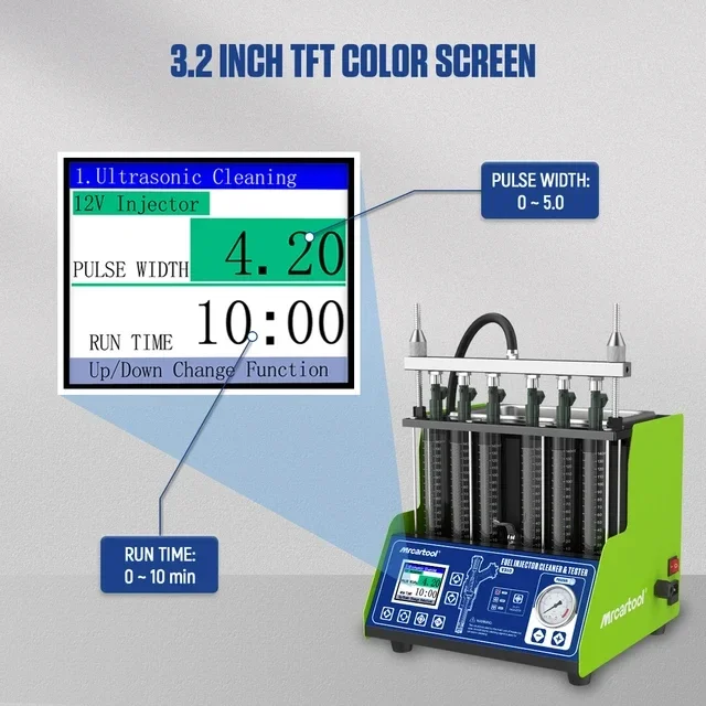 De brandstofdruk, werktijd en pulsbreedte worden automatisch ingesteld door het systeem. Het tijdsysteem is standaard 10s als cyclusperiode, het is niet nodig om het persoonlijk in te stellen. Het systeem zal automatisch en continu drie keer cirkelen om de werkende staat en het brandstofinjectievolume van de brandstofinjector te simuleren wanneer de motor uniform versnelt bij 750 tot 7500 tpm.