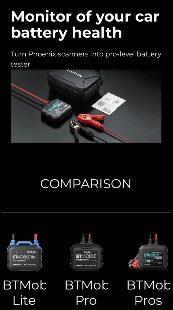 De ProS is een geavanceerde 12V accutester die naadloos integreert met uw Android of iOS apparaat. Met behulp van de bijbehorende Topdon software, biedt het apparaat een gebruiksvriendelijke interface om accu-, start- en laadsystemen te testen. Daarnaast biedt het toegang tot een uitgebreide online database voor het opvragen van specifieke informatie.