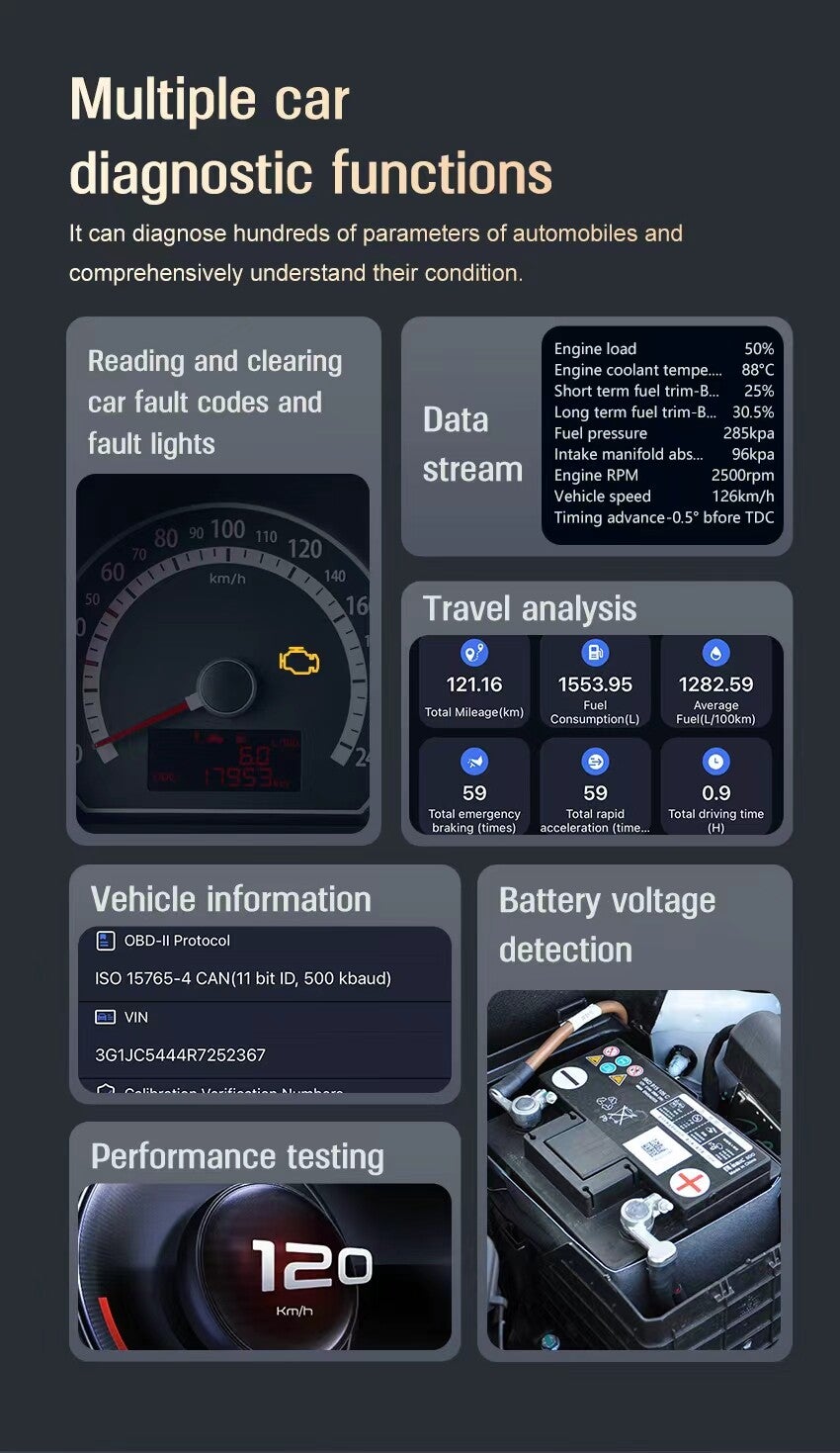 Ondersteunt alle 9-modi van functionaliteit OBD II Al Intelligente diagnose Diagnose van motorfouten Motorstoring licht gewist Auto bevriezen frame Draadloos5.4 Lezen van voertuiginformatie Realtime datastroom Lezen van de batterijspanning van auto's Modus6/Modus 8 Faut-codes aanvraag Zuurstofsensor testen Dashboard Trave-analyse Prestatietesten Ingebouwde 35901-foutcodebibliotheek Monitoring en testen *